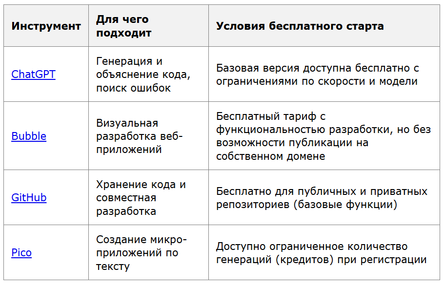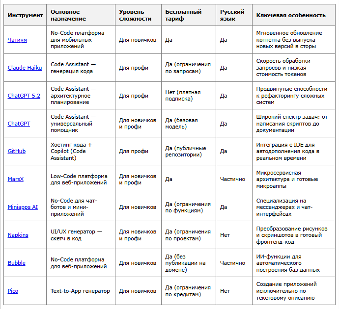 Для новичков оптимальны No-Code платформы с русскоязычным интерфейсом и подробной документацией. Bubble предлагает визуальный редактор и обучающие материалы. Чатиум подходит для создания мобильных приложений без знания Swift или Kotlin. Pico позволяет генерировать простые веб-приложения по текстовому описанию.