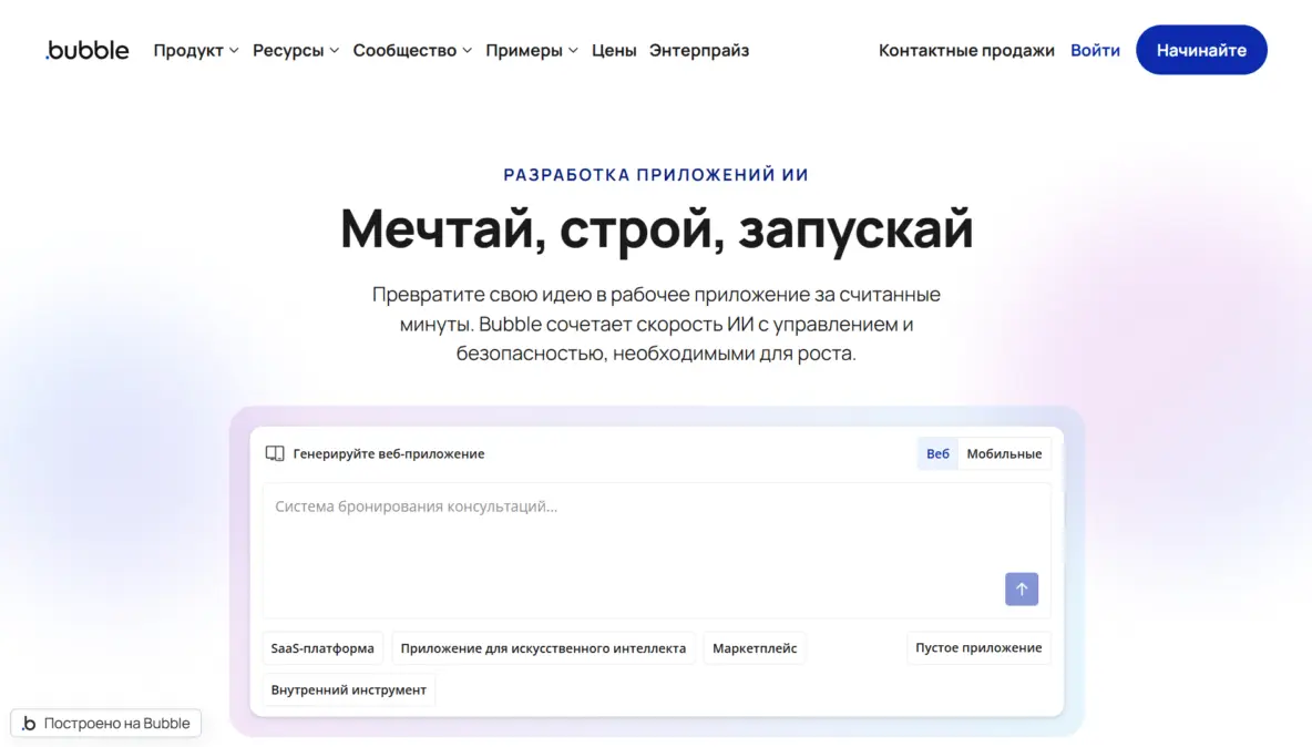 - Bubble: Мощный no-code конструктор, внедривший ИИ-функции для автоматического построения баз данных и логики приложения.