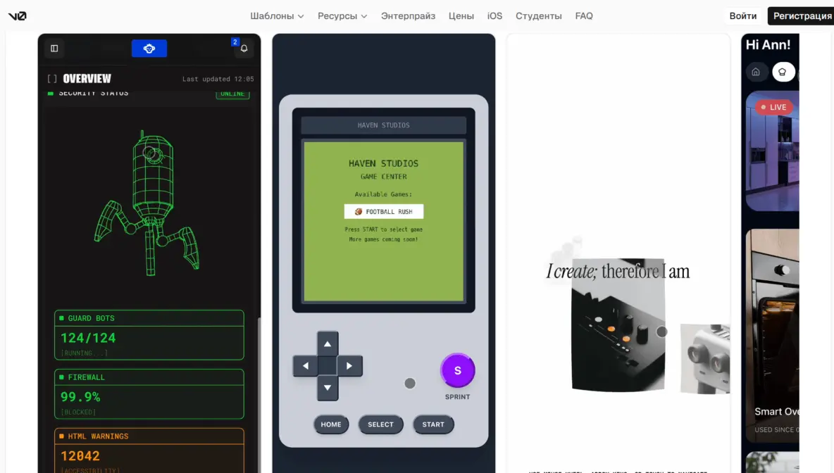 Примеры текстовых запросов (промптов): «Создай приложение для отслеживания личных финансов. Должна быть кнопка "Добавить расход", поле для суммы, выбор категории (еда, транспорт, жильё) и круговая диаграмма расходов за месяц», «Сделай калькулятор расчёта стоимости ремонта. Пользователь вводит площадь помещения в квадратных метрах и выбирает тип материалов (эконом, стандарт, премиум). Результат показывает итоговую смету», «Разработай трекер привычек. Список задач на день с чекбоксами. При выполнении всех задач появляется поздравление. Данные должны сохраняться в браузере пользователя».