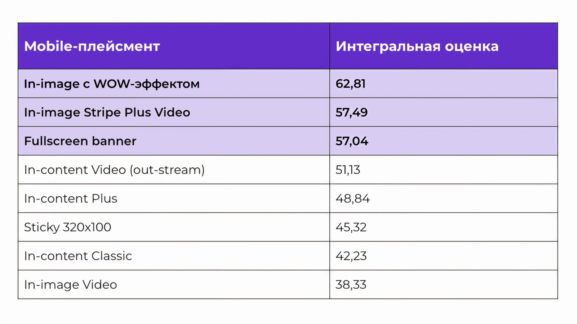 С учетом айтрекинга и QuizScore лидером по совокупной эффективности на mobile становится in-image с WOW-эффектом. Формат сочетает высокую заметность, достаточное время просмотра и наиболее позитивное восприятие в пост-опросе.