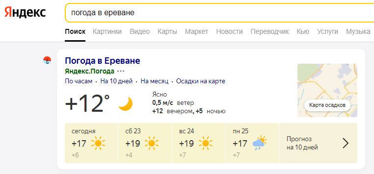Ряд колдунщиков Яндекса решает чисто информационные задачи. Подавляющее большинство из них — виды быстрого ответа, о котором мы упомянули в самом начале статьи. Они дают короткие ответы на конкретные вопросы о погоде, курсе доллара, формуле, авторе литературного произведения или расписании показа фильма в кинотеатрах.