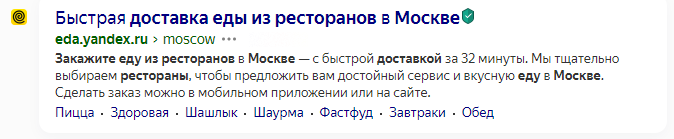 Впрочем, сниппет Яндекс.Еды тоже появляется в топ-10, но выглядит гораздо скромнее: