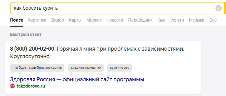 По некоторым запросам, связанным с психологической поддержкой, избавлением от зависимостей, выдается колдунщик с телефонами горячих линий: