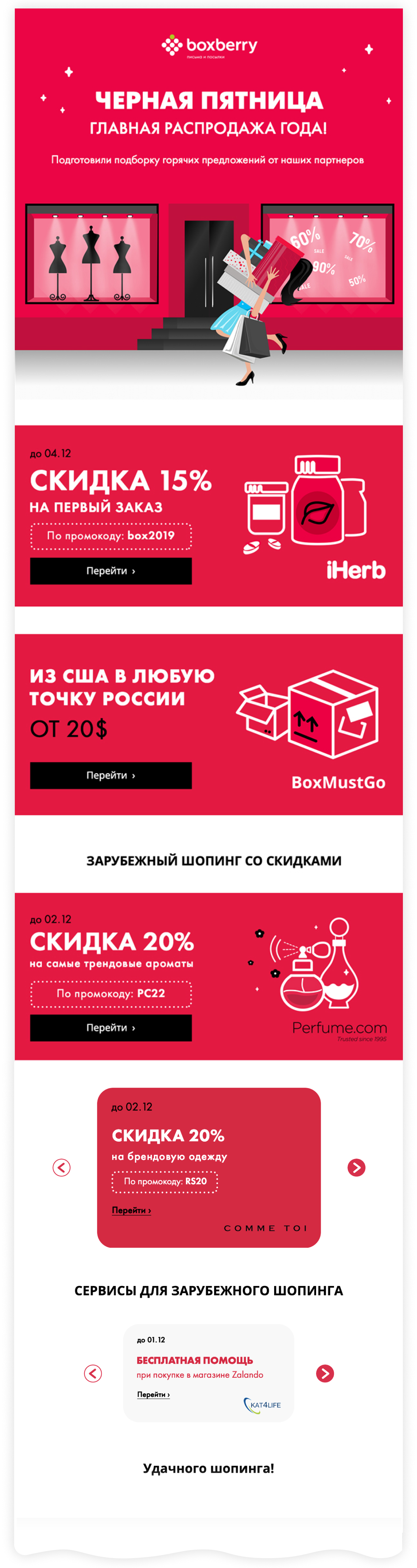 Счастливцевы из письма слева рассказывают, как им живется в новом ЖК, а сервис доставки посылок Boxberry благодаря картинкам и комиксам в email круто удерживает подписчиков. Письма сделаны в Inbox Marketing