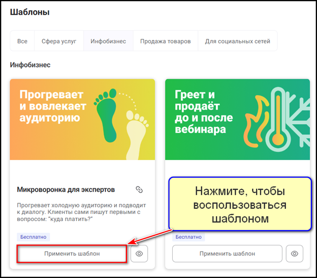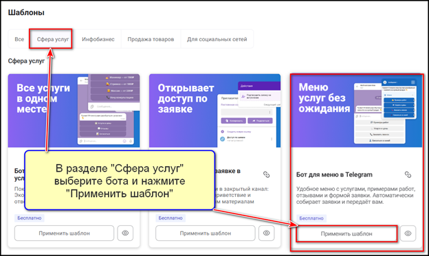 10. Откроется страница с большим выбором шаблонов на разные случаи жизни. Часть из них можно адаптировать и под нужды юристов. Откройте раздел «Сфера услуг», найдите бота для меню в Телеграм и кликните «Применить шаблон».