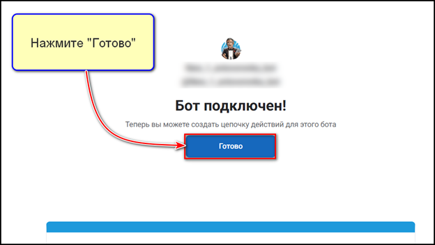 8. В течение нескольких секунд появится уведомление об успешном подключении бота. Нажмите «Готово».