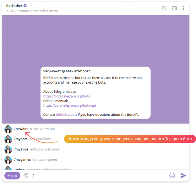 1. Первое, что нужно сделать – зарегистрировать нового бота. Откройте Telegram и найдите BotFather – официальное приложение-помощник от разработчиков мессенджера, в котором создаются и настраиваются все существующие боты. Запустите его нажатием на кнопку «Старт» и введите или выберите в меню команду «/newbot».