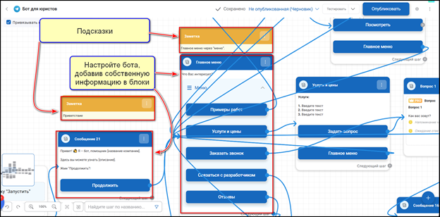 12. Вы попадете на страницу работы с шаблоном. Этот бот интересен тем, что присылает человеку меню, в котором можно выбрать и посмотреть услуги и цены, заказать звонок, посмотреть отзывы или связаться с живым человеком (это может быть секретарь, ассистент или сам юрист). Также он может напоминать о себе, если пользователь долгое время не отвечает. Вам нужно лишь доработать этого бота под ваши задачи: укажите свое приветствие, свои цены и услуги и т.д. Чтобы вам было проще работать, возле большинства синих блоков-сообщений есть желтые блоки с подсказками, в которых говорится, что должно быть в том или ином блоке. Следуйте им и настройте шаблон под себя.