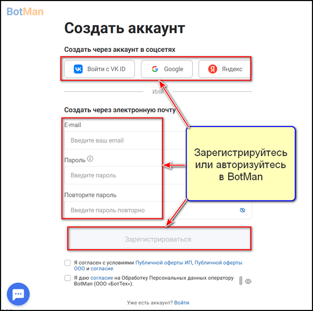 5. Теперь откройте BotMan.pro и пройдите регистрацию, указав ваш e-mail и пароль либо авторизуйтесь через соцсети.
