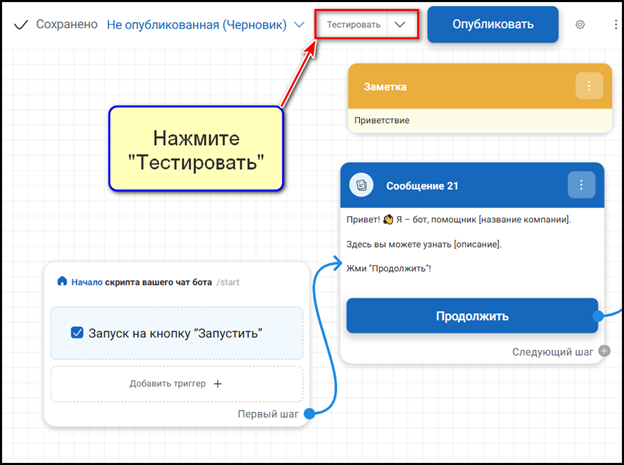 13. После того, как работа будет завершена, нажмите «Тестировать», чтобы проверить работу бота. Вы перейдете в Телеграм и увидите бота в том виде, в каком он будет доступен клиентам. Убедитесь, что он верно присылает каждое сообщение и правильно выполняет все действия. Ошибок быть не должно: если чат бот работает неправильно, это не понравится людям, и они будут блокировать его, прекращая работу с ним.