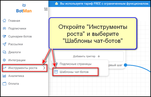 9. Вы окажетесь на странице создания нового сценария. Откройте меню в левой части экрана и найдите в нем «Инструменты роста». Разверните вкладку и выберите «Шаблоны чат-ботов».