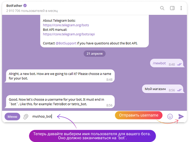 3. Теперь укажите username – уникальное пользовательское имя вашего бота, которое будет отражено в ссылке на него. В конце через нижнее подчеркивание обязательно добавьте слово «bot», иначе оно не будет принято. Можно использовать латиницу, а если обнаружится, что такой username уже есть, добавьте цифры, дополнительные слова или подчеркивания.