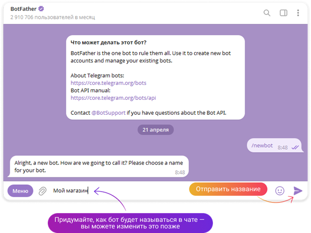 2. Теперь придумайте боту имя, которое будут видеть ваши клиенты. Оно должно быть запоминающимся, простым в написании и понятным для людей. Используйте латиницу и кириллицу, цифры, символы. Желательно, чтобы имя также отражало род вашего занятия.