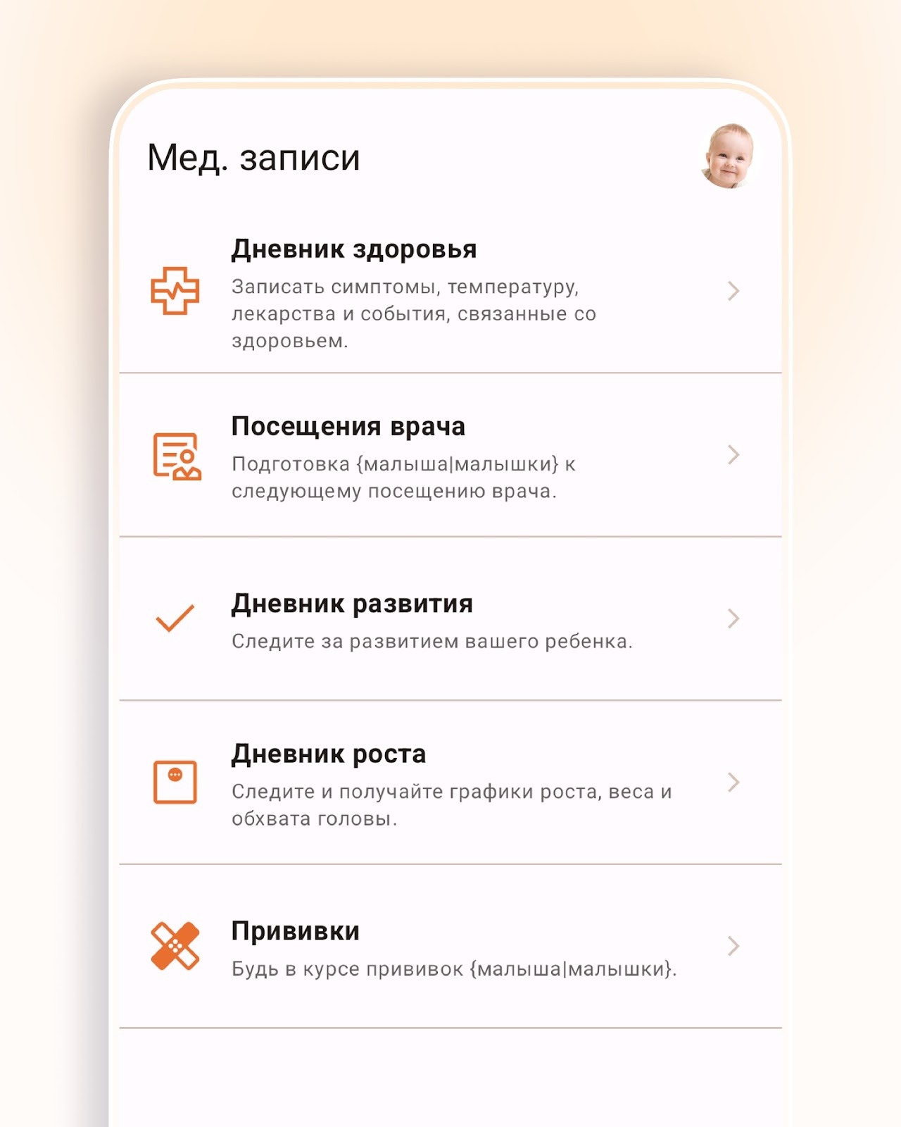 Трекер. Наблюдение за здоровьем: вес и рост, обхват головы, наличие заболеваний у ребенка, прививки, график сна. Фиксируйте даты посещения врачей, получайте рекомендации;