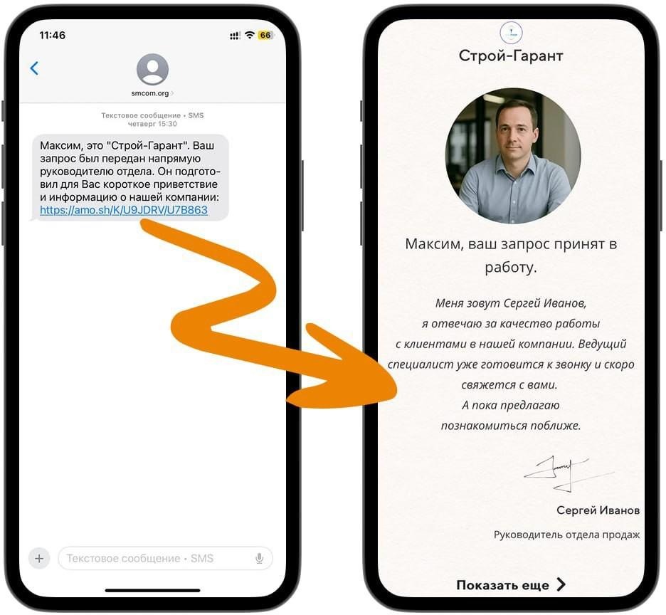 В нишах, где клиенту обрывают телефон, вы выделяетесь. СМС-визитка работает как мощный прогрев: перед звонком вашего менеджера, клиент уже заочно знаком с компанией, видел фото директора и ваши работы. Это снимает напряжение «холодного» общения.