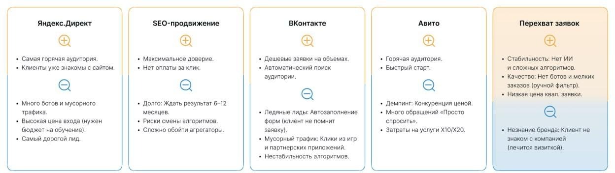 «Почему мы их не берем: ксли мы возьмем такой сайт, мы будем звонить человеку, который искал бассейн, и предлагать ему фундамент. Это бесит людей, снижает конверсию и удорожает заявку. Мы берем в работу только тех, где сидит ваша прямая целевая аудитория».
