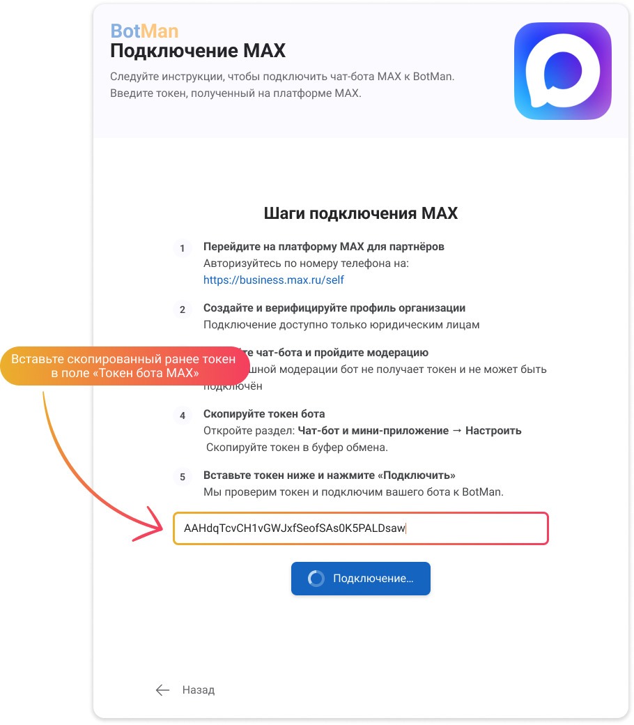 быстро настроите токен и подключите бота к партнёрским системам;