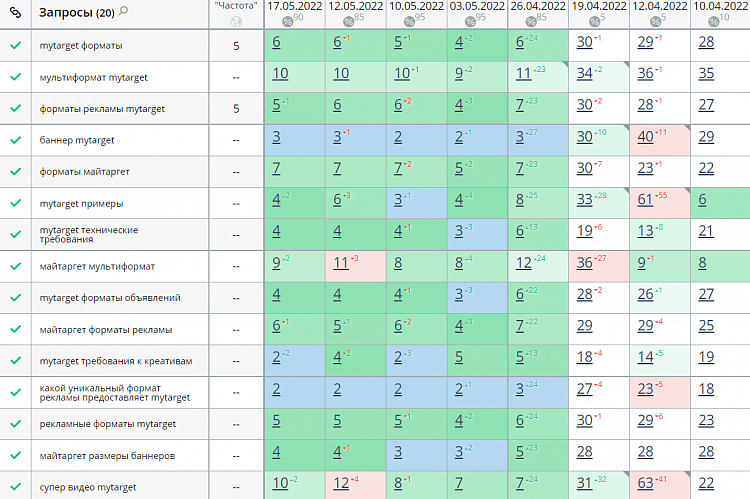 Пример движения блога по запросам, связанным с рекламной платформой myTarget, за пять недель