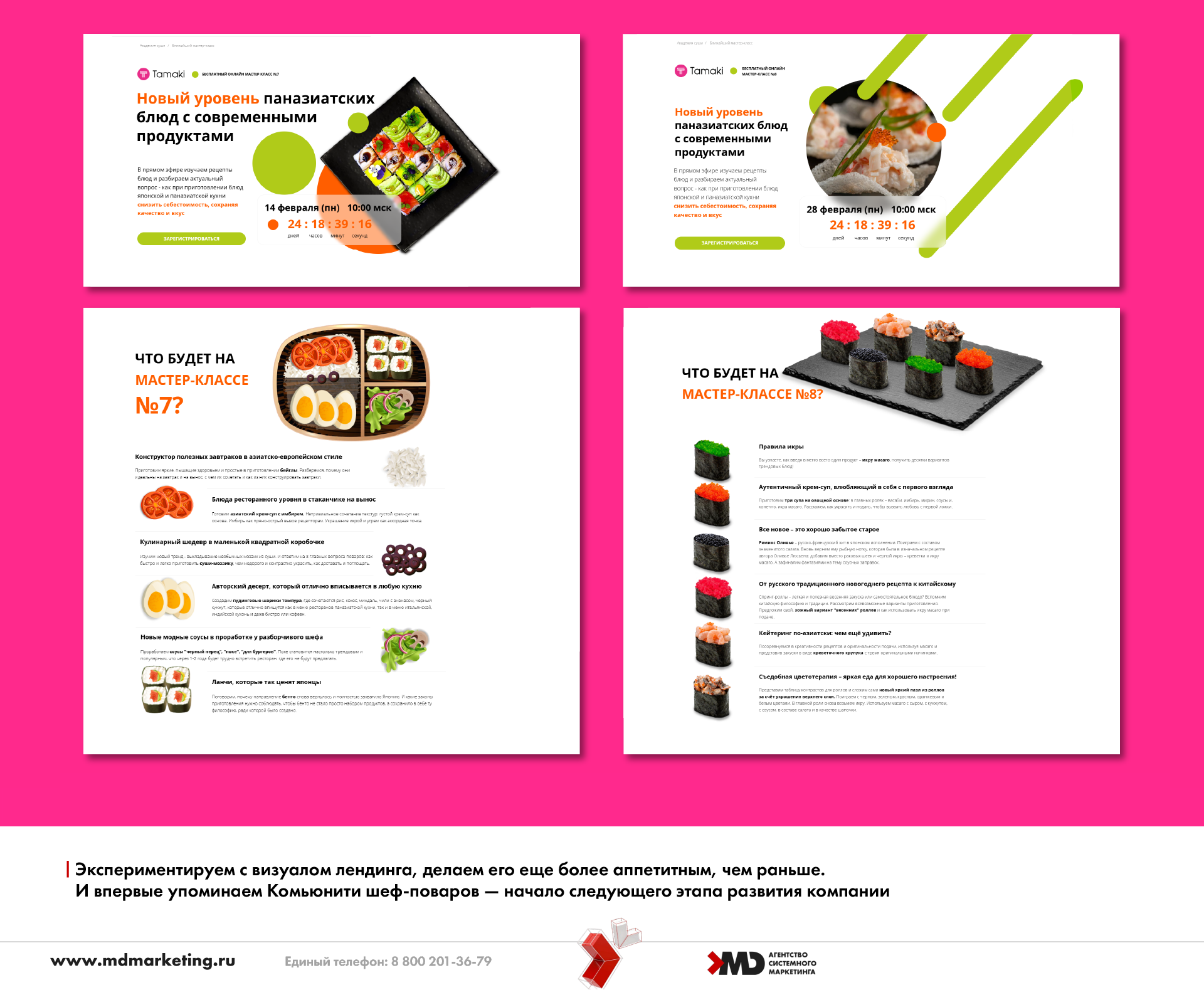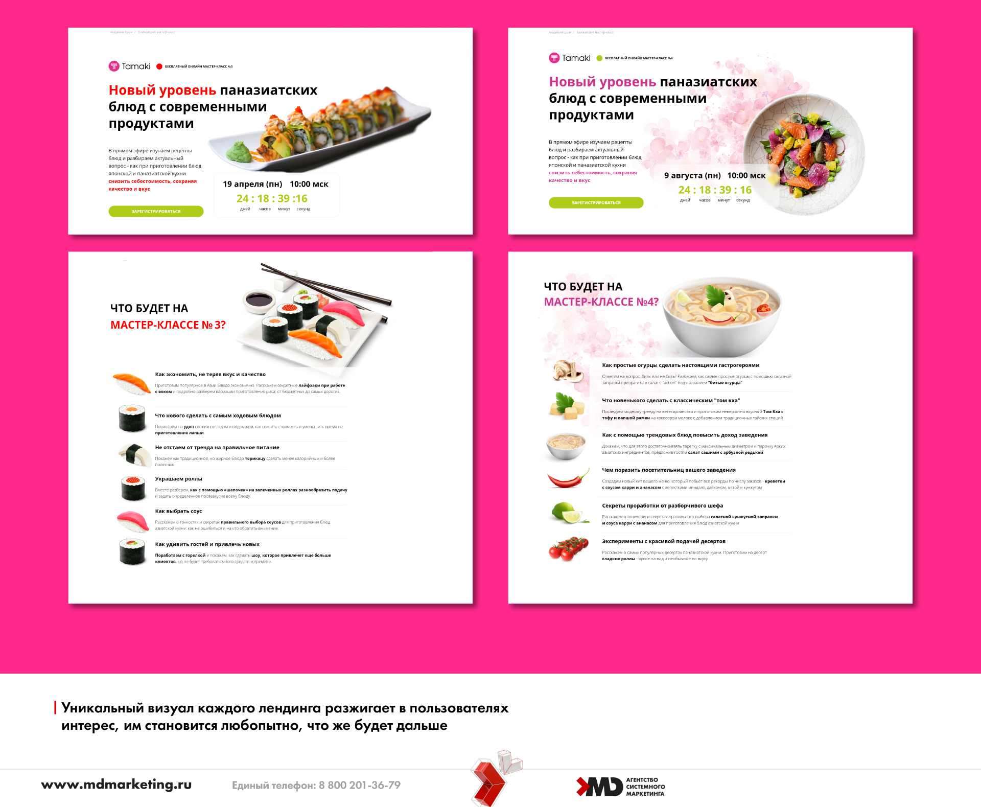 К каждому мастер-классу разрабатывали лендинги: ни один не был похож на предыдущий, зато каждый отражал тему и настроение МК.