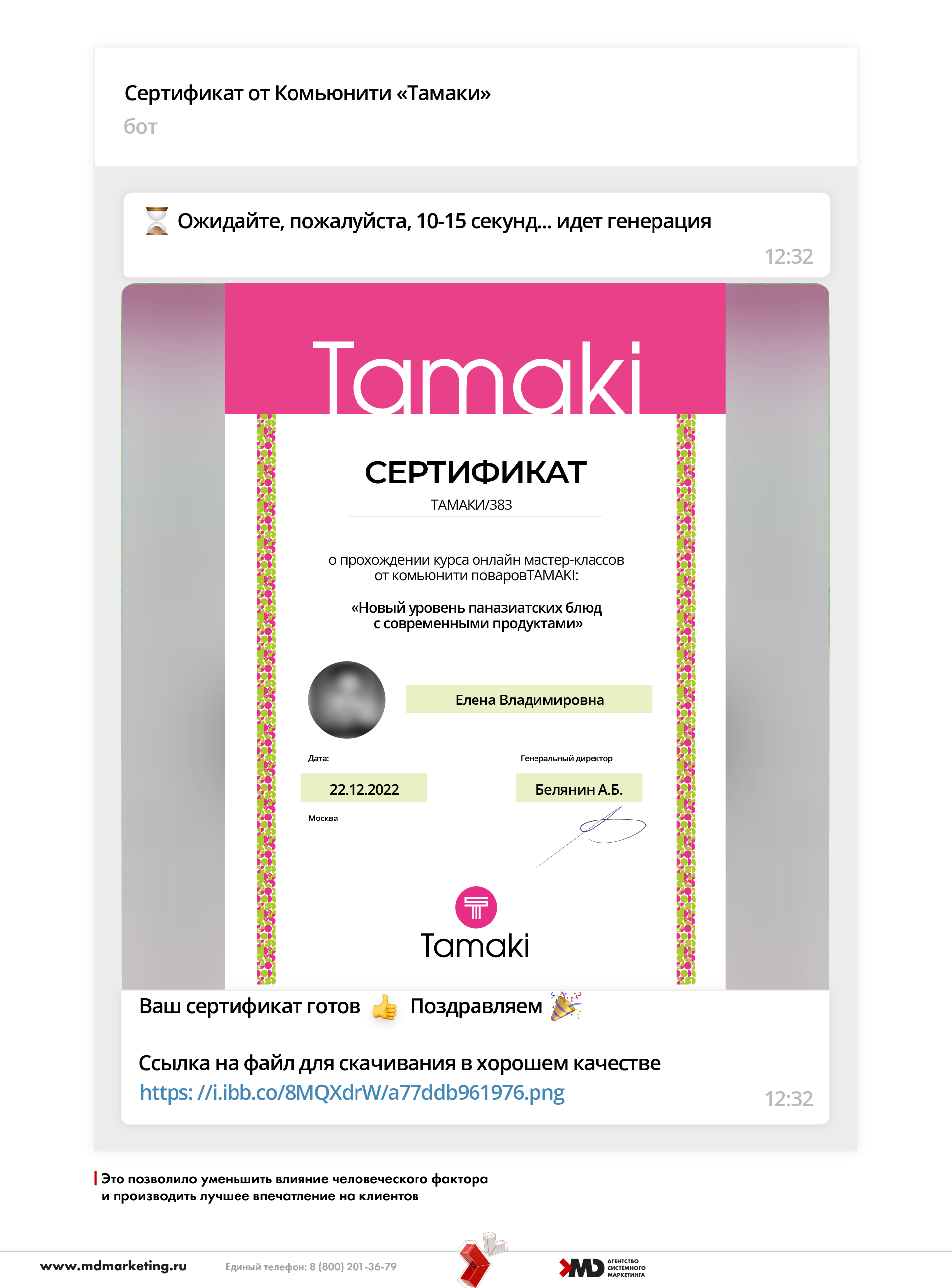 Благодаря переходу на Геткурс мы автоматизировали все процессы. Часто менеджеры онлайн-школ забывают о важных мелочах, например, отправить сертификат или попросить оставить отзыв. У нас эти процессы были автоматизированы, например, клиент отправлял свои данные чат-боту и сразу получал сертификат. В 2020—2022 такой функционал практически не использовался, был у единиц топовых школ. Готового решения еще не было, мы разрабатывали его с нуля.