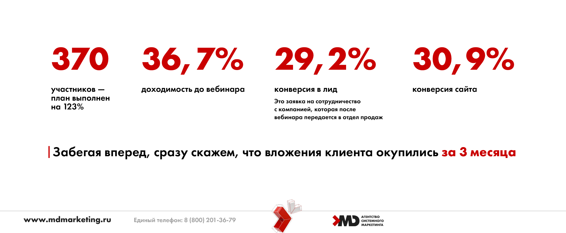 На реализацию Академии под ключ и лендинга для первого мастер-класса у нас ушло 45 дней. Мы провели вебинар, на который смогли привлечь 370 участников. Напомним, что план минимум был 300.