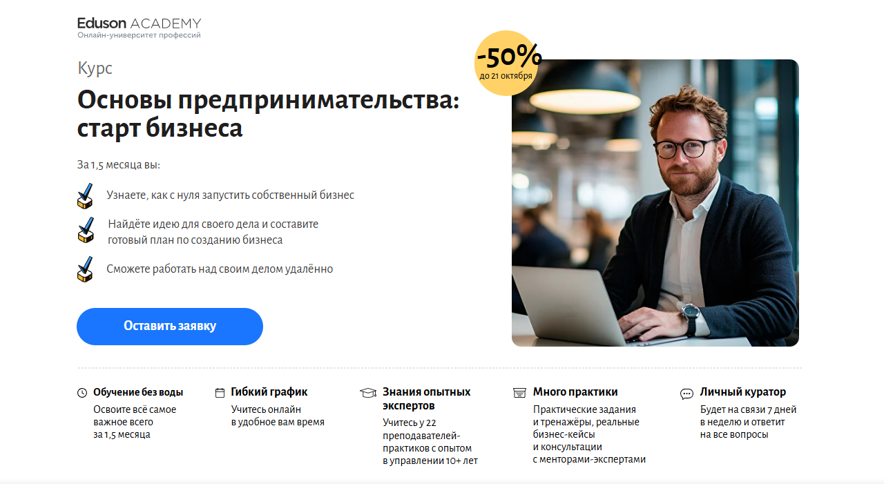 Основы предпринимательства: старт бизнеса от Eduson Academy — практический курс с 69 интерактивными уроками и консультациями менторов, где за 1,5 месяца вы создадите готовый план запуска собственного дела.