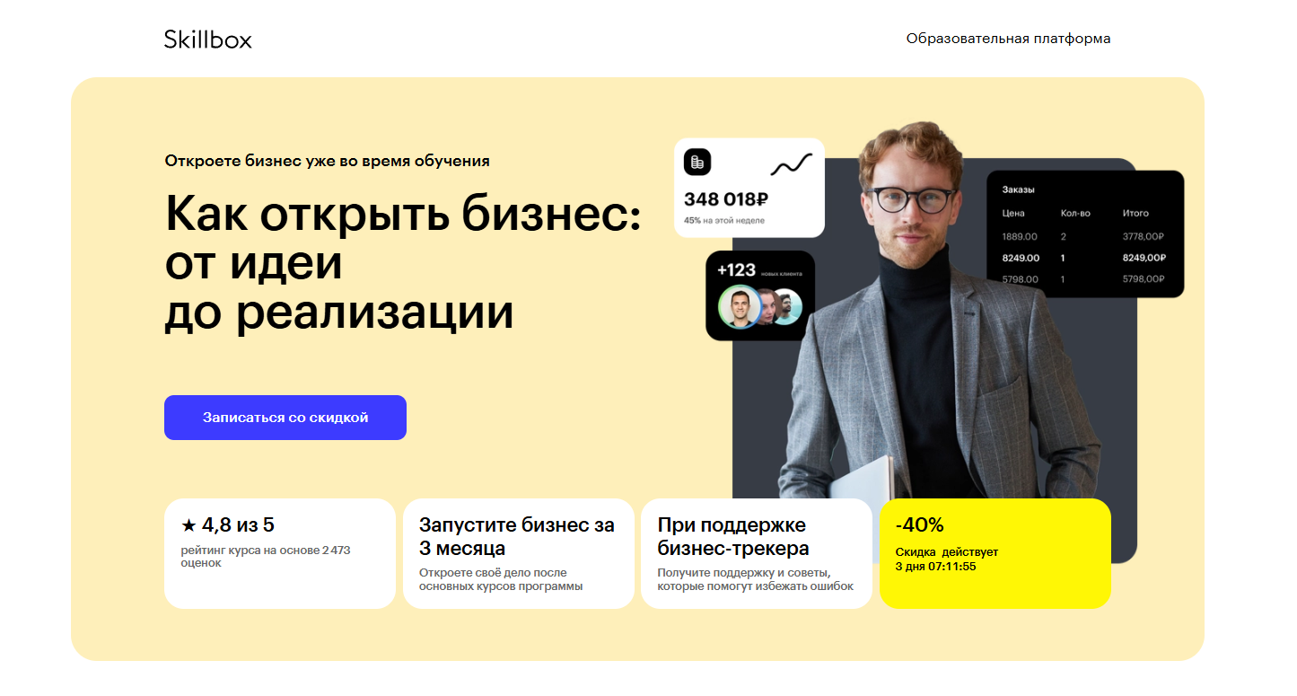 Как открыть бизнес: от идеи до реализации от Skillbox — пакет курсов с готовым бизнес-планом на год, включающий модули по финансам, маркетингу и запуску на маркетплейсах.