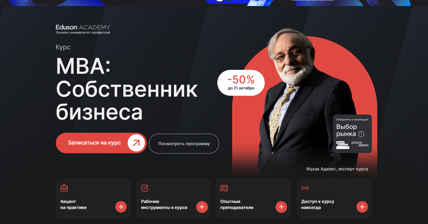 MBA: Собственник бизнеса от Eduson Academy — комплексная программа профессиональной переподготовки с 624 уроками для владельцев компаний, которые хотят системно освоить управление всеми аспектами бизнеса.