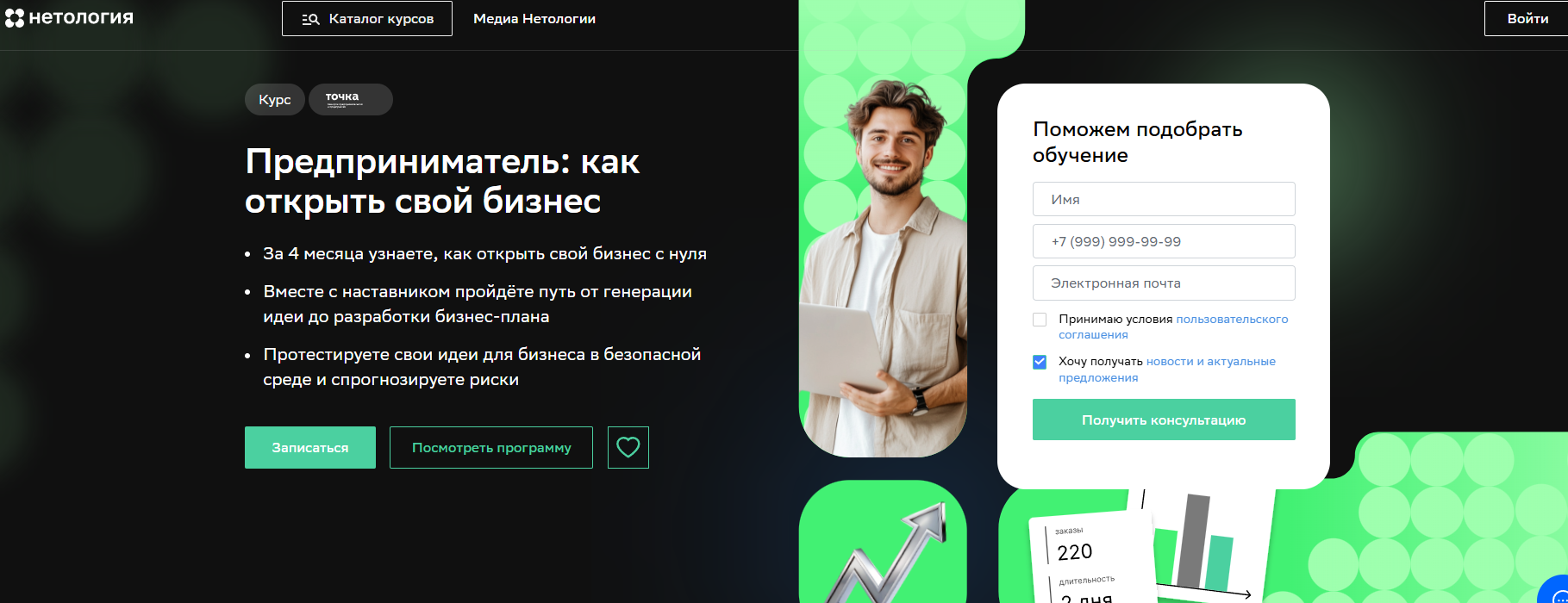 ⭐Предприниматель: как открыть свой бизнес от Нетологии — образовательная программа с фокусом на цифровые технологии и онлайн-инструменты для современного предпринимательства.