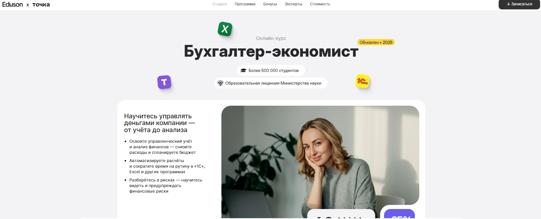 Бухгалтер-экономист от Eduson Academy — 479 интерактивных уроков с тренажерами по 1С и Excel, поддержка куратора целый год и диплом государственного образца после успешного прохождения обучения.