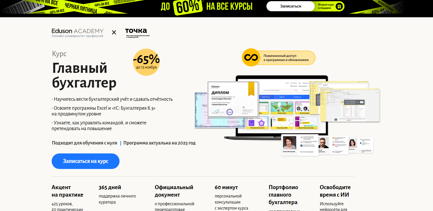 Главный бухгалтер от Eduson Academy — 425 уроков с практическими кейсами, личная консультация эксперта и возможность трудоустройства в банк Точка после окончания курсов.