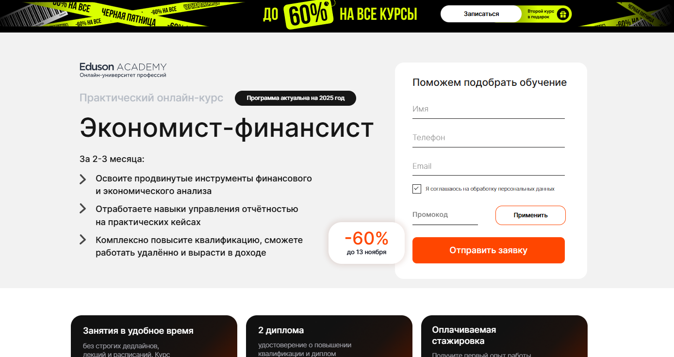 ⭐ Экономист-финансист от Eduson Academy — 204 интерактивных урока и 16 бизнес-кейсов от крупных компаний с оплачиваемой стажировкой на реальном проекте.