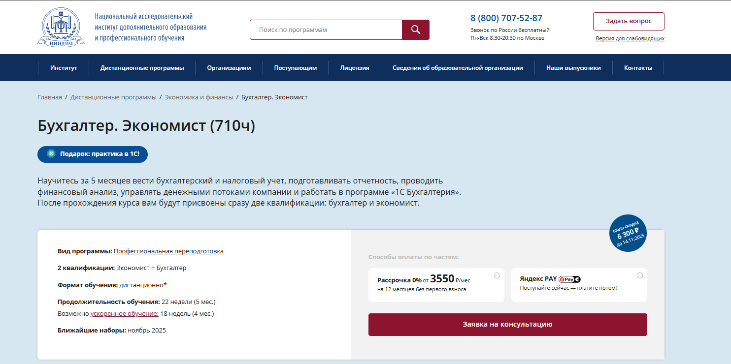 Экономист и бухгалтерский учет от НИИДПО — объемная программа переподготовки на 710 часов для глубокого погружения в профессию бухгалтера-экономиста с получением диплома.