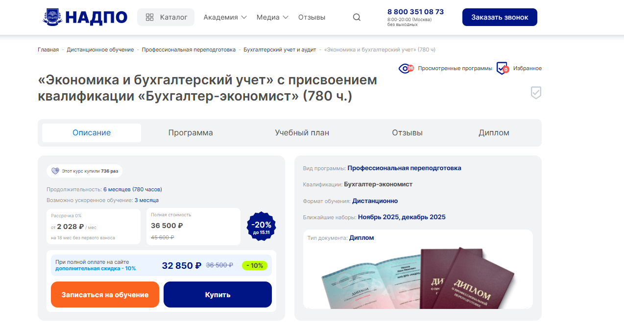 Экономика и бухгалтерский учет от НАДПО — гибкая программа на 6 месяцев или ускоренное обучение за 3 месяца с рассрочкой оплаты на 18 месяцев без первого взноса.