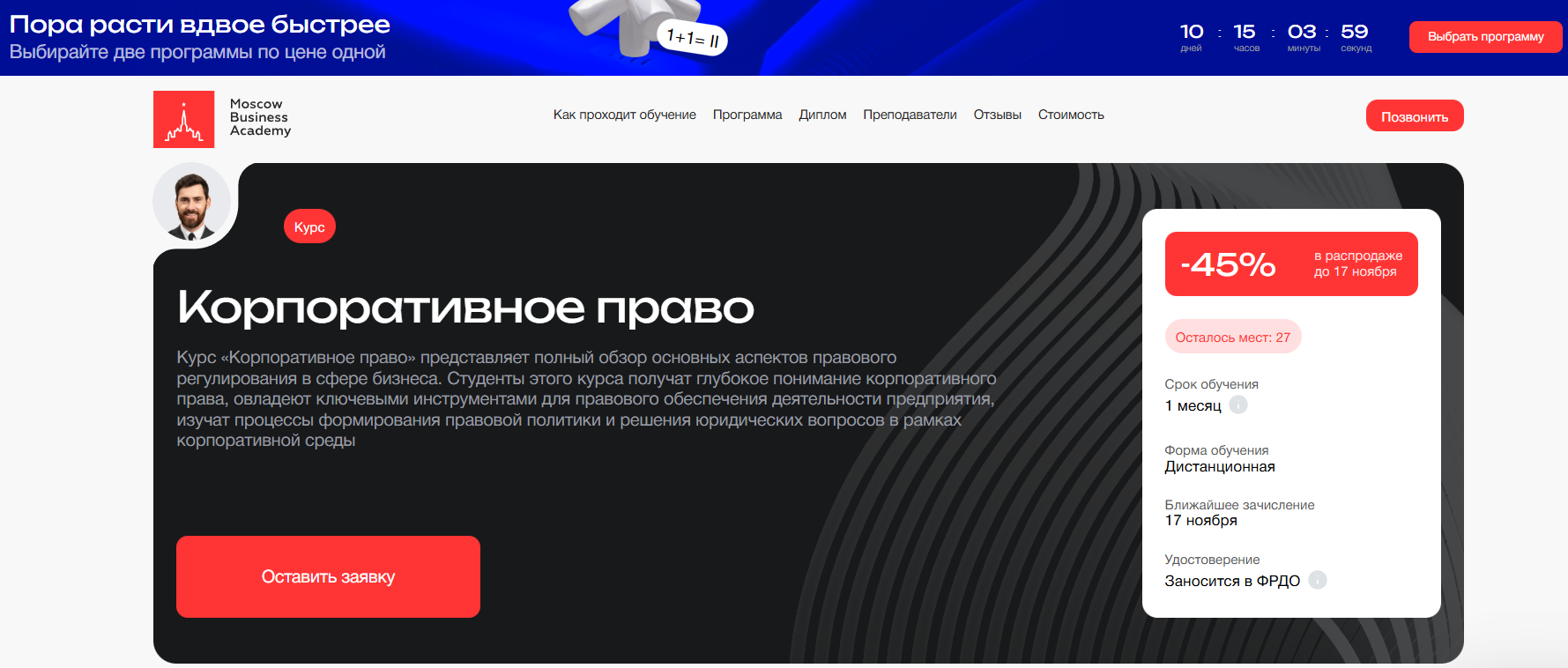 Корпоративное право от Moscow Business Academy — месячный интенсив по правовому регулированию предпринимательской деятельности с удостоверением государственного образца и сертификатом MBA.