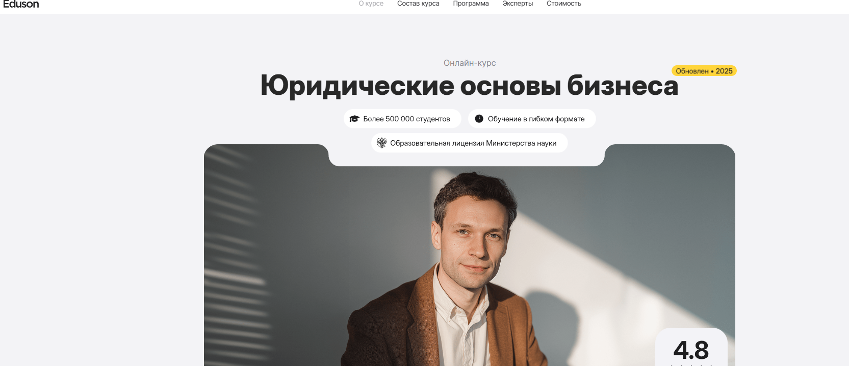 Юридические основы бизнеса от Eduson Academy — годовая программа с 14 модулями от договорной работы до международных закупок, готовыми чек-листами и шаблонами для немедленного применения в деятельности компании.