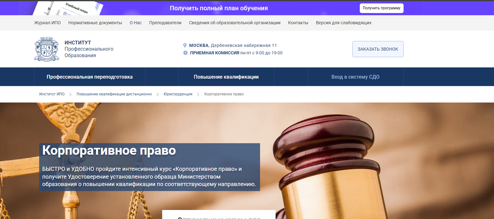 Корпоративное право от Института ПО МСК — дистанционное повышение квалификации по юриспруденции с углубленным изучением правового обеспечения деятельности юридических лиц и корпоративных отношений.