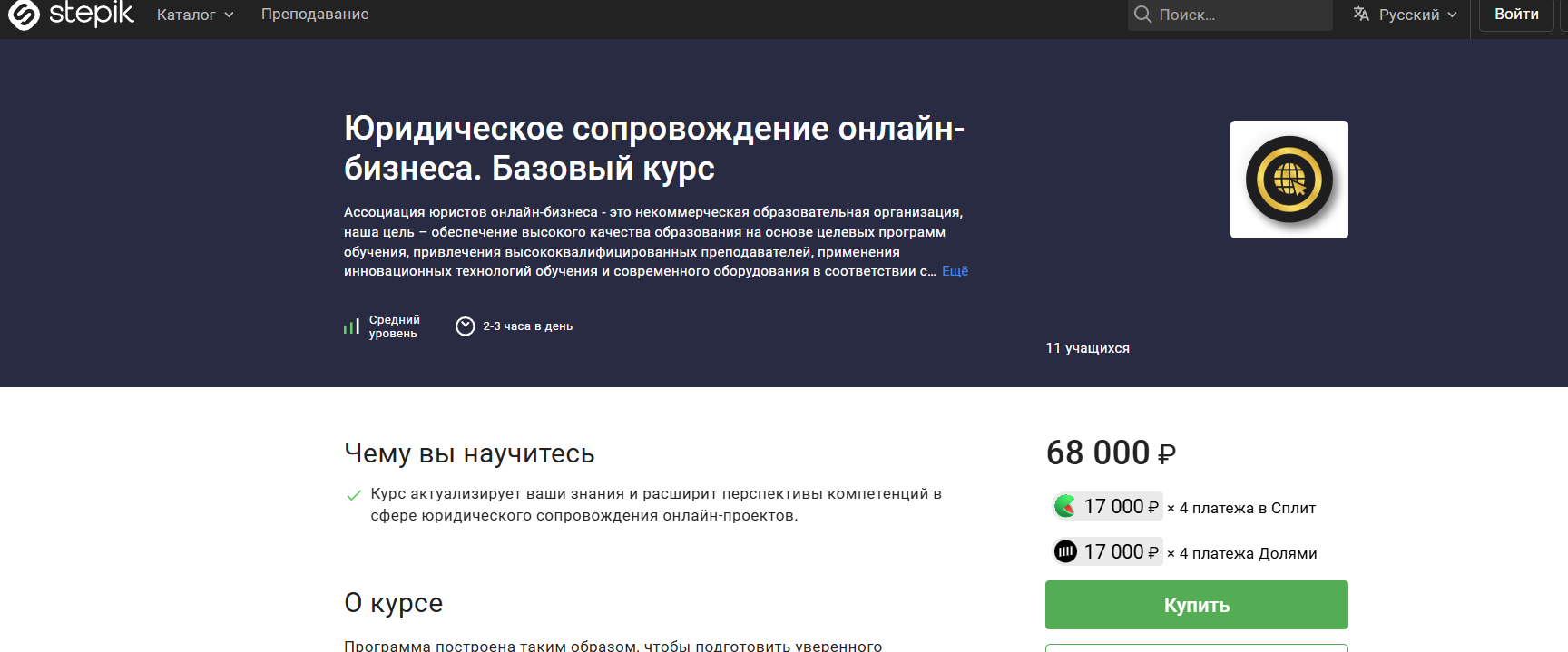 Юридическое сопровождение онлайн-бизнеса от Stepik — практический курс по правовому регулированию интернет-коммерции, защите персональных данных и составлению договоров оферты для электронных проектов.