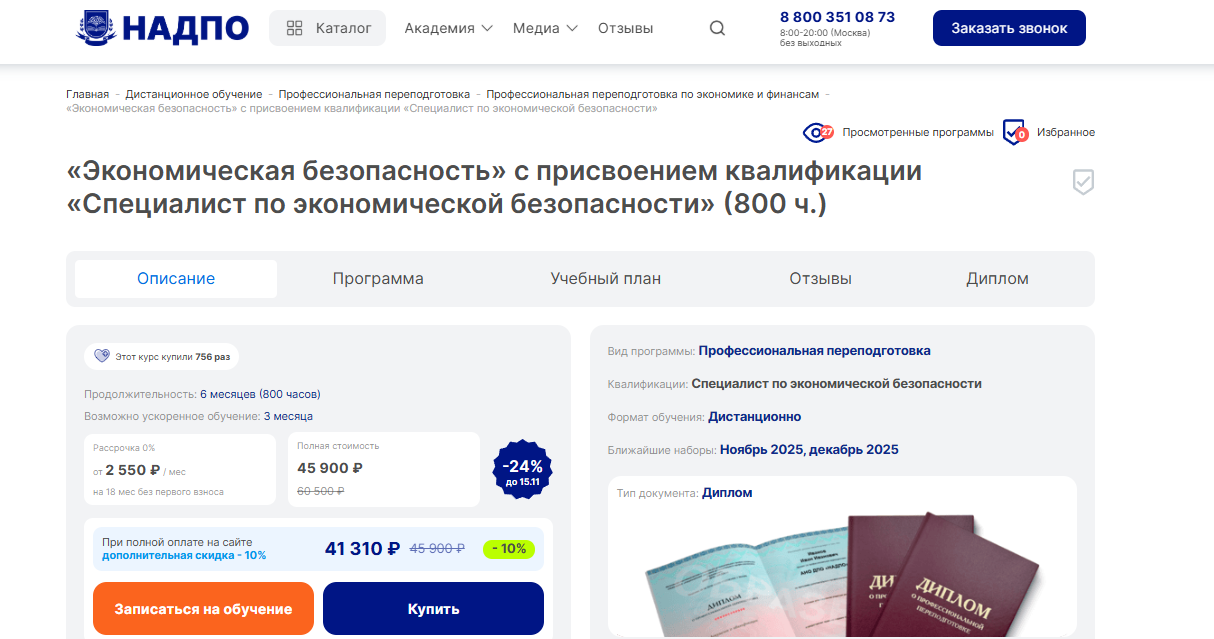 Экономическая безопасность от НАДПО — профессиональная переподготовка на 800 часов с присвоением квалификации и рассрочкой от 2550 рублей в месяц.