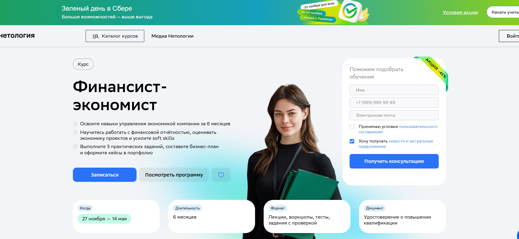 Финансист-экономист от Нетологии — пятимесячный курс по управлению экономикой компании с портфолио проектов и помощью в трудоустройстве от HR-консультантов школы.