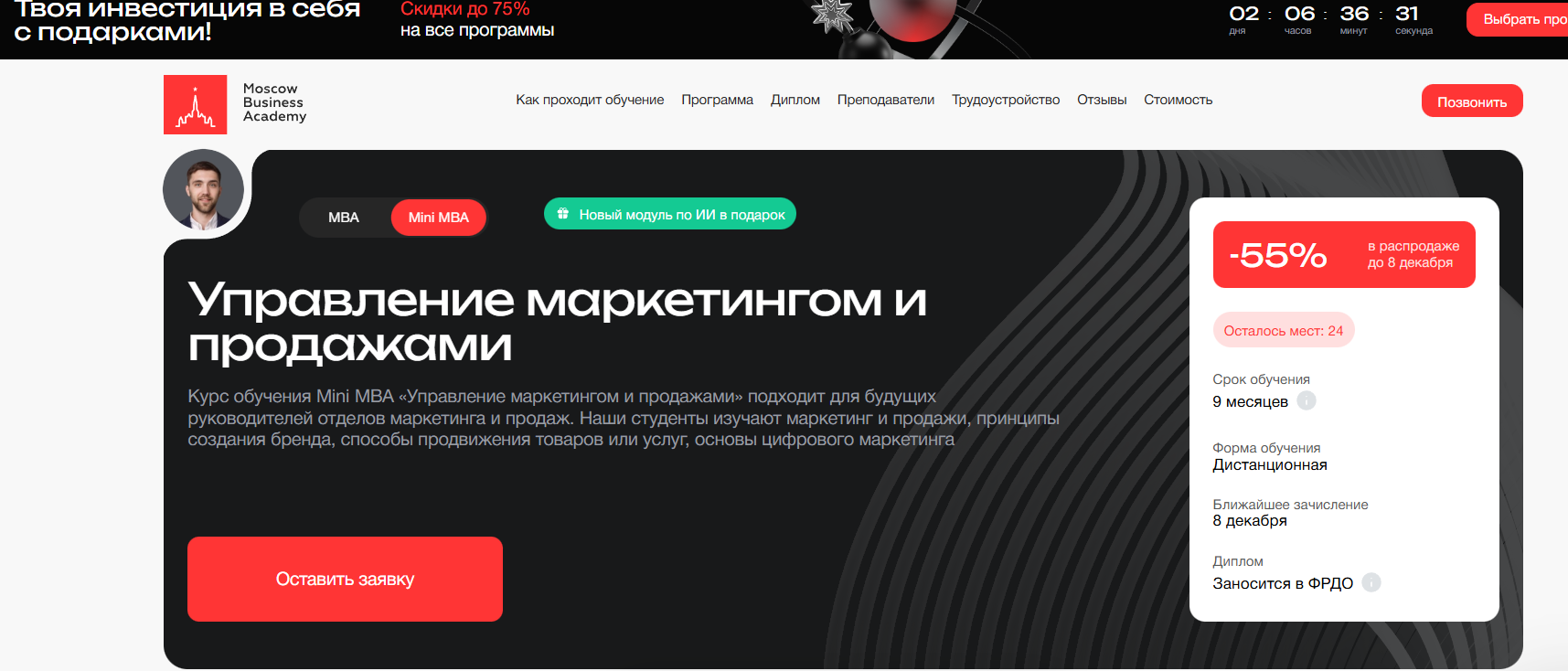 Управление маркетингом и продажами от Moscow Business Academy — курс Mini MBA длительностью 9 месяцев с 175 видеоматериалами и практическими заданиями от спикеров Сколково и SkillBox.