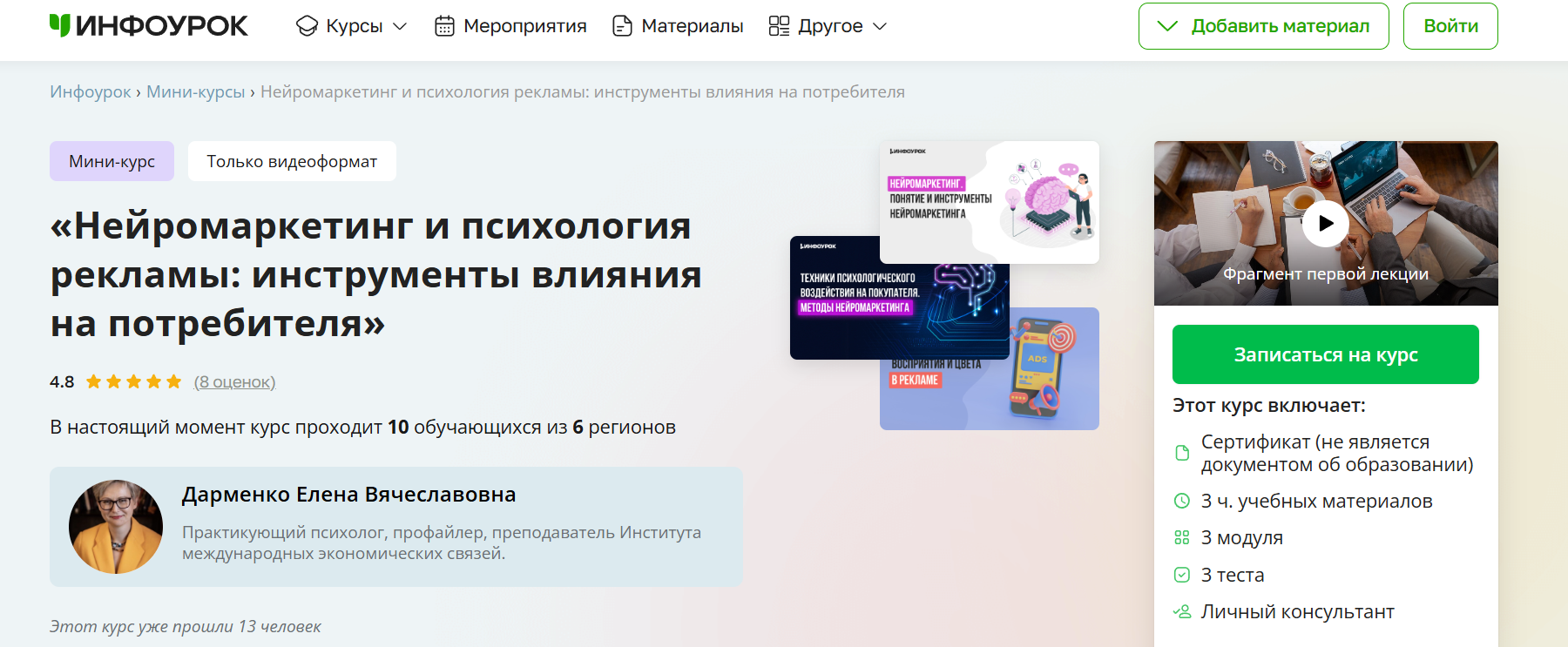 Нейромаркетинг и психология рекламы: инструменты влияния на потребителя от Инфоурок — специализированный курс по изучению инструментов нейромаркетинга и техник манипуляции в рекламе для повышения эффективности коммуникаций.