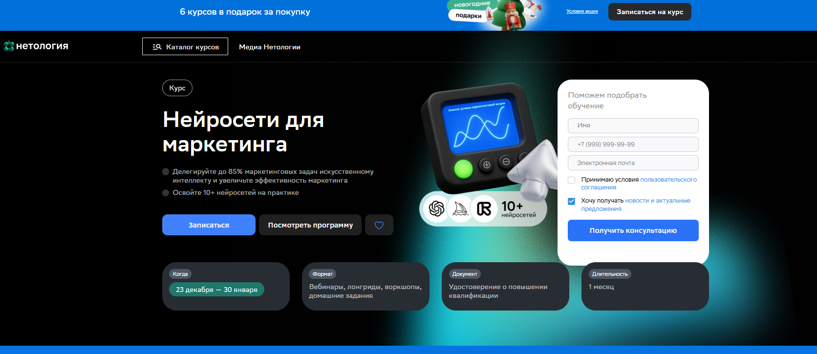 Нейросети для маркетинга и продаж от Нетологии — программа по использованию искусственного интеллекта и нейросетей в маркетинге с изучением ChatGPT, YandexGPT и Midjourney для автоматизации задач.