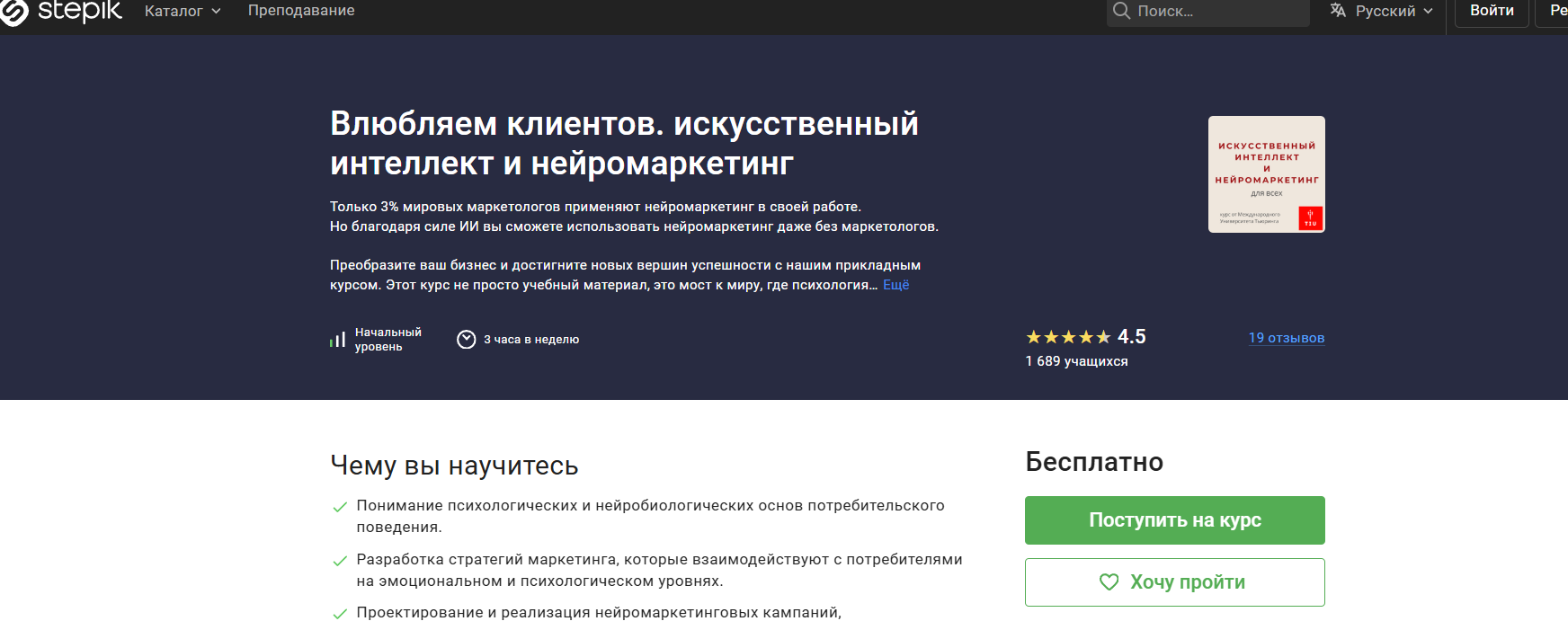 Влюбляем клиентов: искусственный интеллект и нейромаркетинг от Stepik — онлайн-программа с изучением применения ИИ и нейромаркетинговых методов для влияния на потребительское поведение, доступна на интерактивной платформе.