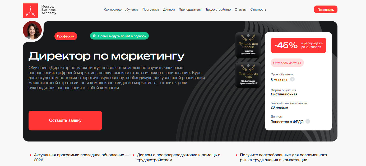 Директор по маркетингу от Moscow Business Academy — курс профессиональной переподготовки для управленцев с модулями по стратегическому менеджменту, лидерству и нейромаркетингу.
