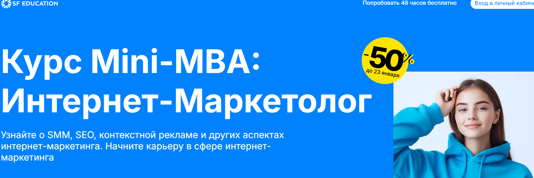 Интернет-маркетолог от SF Education — курс с практическими заданиями на реальных проектах и документом о профессиональной переподготовке государственного образца.