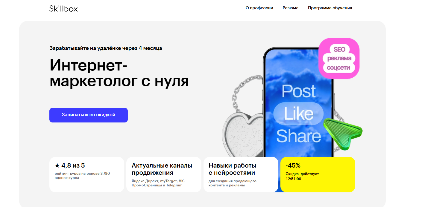 Интернет-маркетолог с нуля от Skillbox — практический курс для новичков с возможностью начать зарабатывать через 4 месяца и доступом к материалам навсегда.