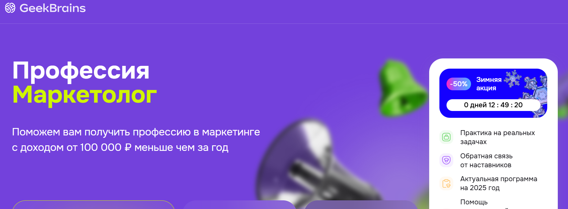 ✨ Digital-маркетинг от GeekBrains — университетская программа с систематическим изучением всех направлений интернет-маркетинга и помощью в трудоустройстве.