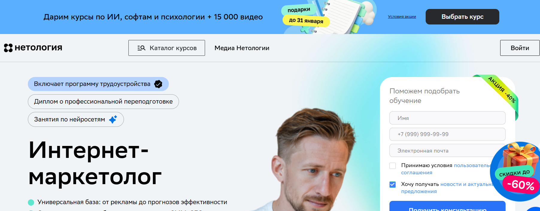 Интернет-маркетинг от Нетологии — программа длительностью 9 месяцев с вебинарами, воркшопами и бонусным модулем по работе с нейросетями для маркетологов.