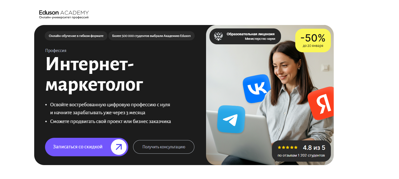 Интернет-маркетолог от Eduson Academy — комплексная программа обучения с 279 уроками и 26 практическими кейсами для освоения всех направлений digital-маркетинга за 6 месяцев.